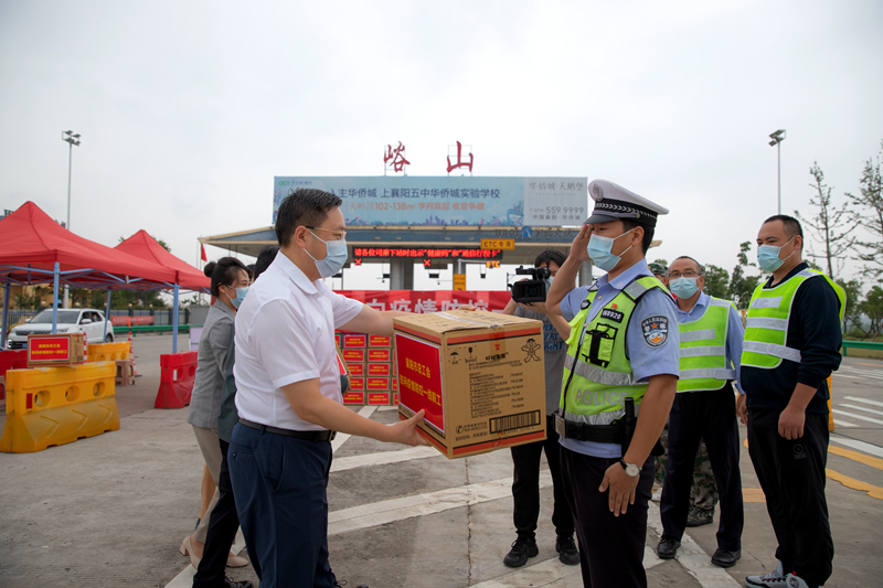来到峪山高速出口,公安、交通、卫健等部门工作人员正在认真查验驾乘人员的核酸检测报告、健康码等。赵芝斌看了交通卡口人员配备和值守、管控流程、执勤人员自身安全防护、检测记录等情况,向奋战在疫情防控一线的工作人员致以亲切慰问,提醒他们在严格落实防控举措的同时,做好自我防护工作,守好襄阳大门,真正为全市人民筑起一道健康“长城”。