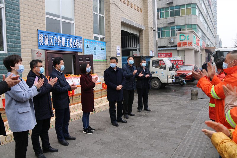 在长虹桥北垃圾转运站,柴普军一行对辛勤工作在一线的环卫工人表示肯定和感谢,给他们送上节日的礼物和祝福。柴书记表示,环卫工人为了我们城市的形象,特别在新春佳节期间,还要坚守在岗位上,用勤劳的双手为樊城广大市民群众营造了一个绿色生态、干净整洁靓丽的新春环境,希望他们继续发扬不怕脏、不怕苦的精神,为扮靓樊城而努力。
