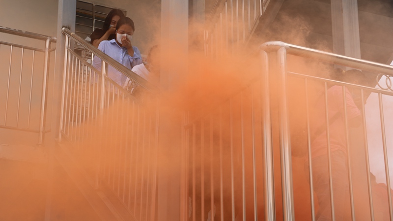 在应急演练环节,邓翔为大家现场逐一演示灭火器、消防水带等消防应急用具的正确使用方法。随后,在楼道内放烟雾弹,模拟遇火灾后楼道疏散现场,引导人员掌握正确疏散方法,并将木块放在铁桶内点燃,模拟火灾现场,引导参训人员进行灭火器实操,确保大家掌握灭火器要领,快速有效扑灭火灾。