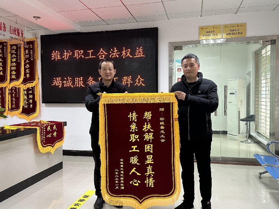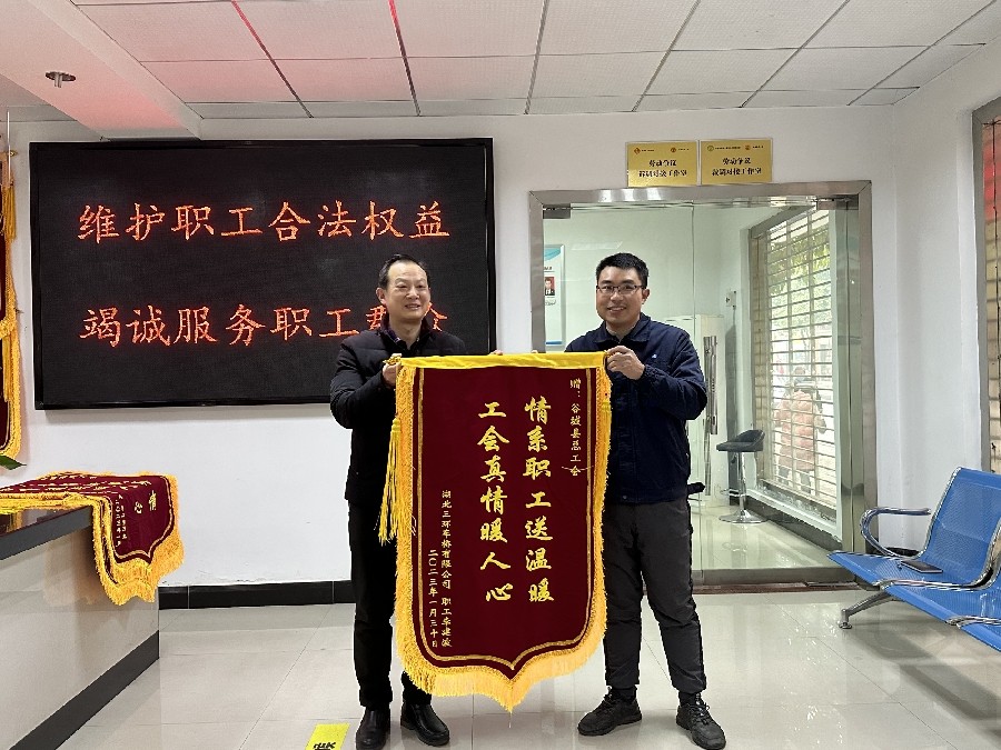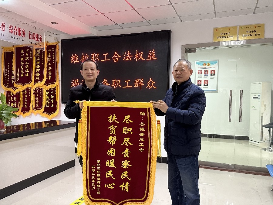 (通讯员:曹玉兵 李锦)2月7日,湖北三环锻造公司、三环车桥公司等公司工会负责人和困难帮扶受助职工一行,向谷城县总工会困难职工帮扶中心送来了写有“尽职尽责察民情 扶贫帮困暖民心”、“情系职工送温暖 工会真情暖人心”的锦旗。谷城县总工会党组书记、常务副主席曾涛接下锦旗。