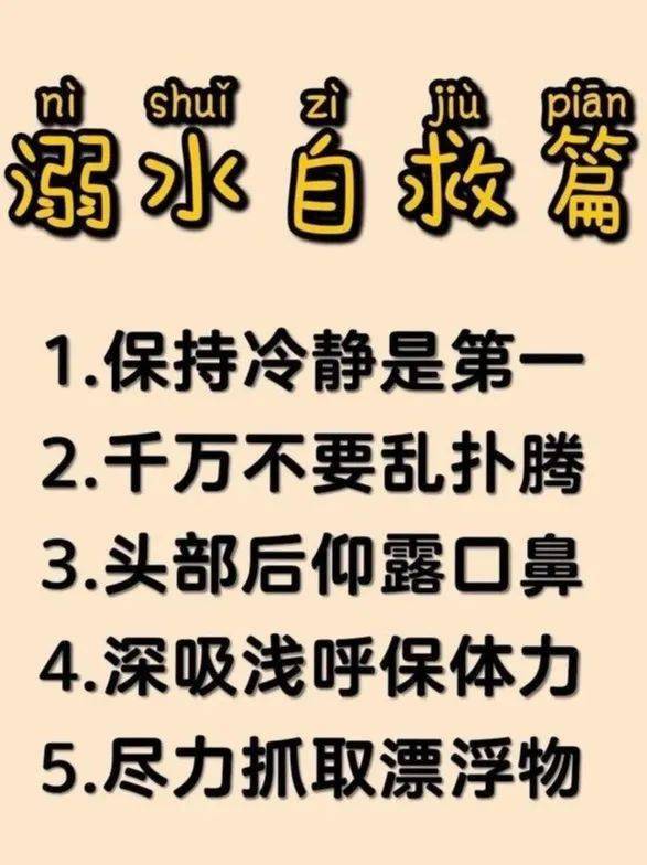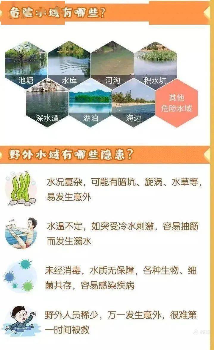 一、溺水常见原因 1.在水边玩耍,下水摸鱼,捡落入水中的物品。 2.游泳时抽筋或在水中打闹。 3.到井边打水不慎落入井中。 4.雨天掉入沟坑。 5.暴雨来临时无躲避处所。 野外水域的危险不言而喻,但依旧有很多野外溺水事故的发生!这些溺水悲剧,一次又一次地为我们敲响安全警钟,也提醒我们一定要加强对孩子的防溺水安全教育,让孩子认识并主动远离危险水域。
